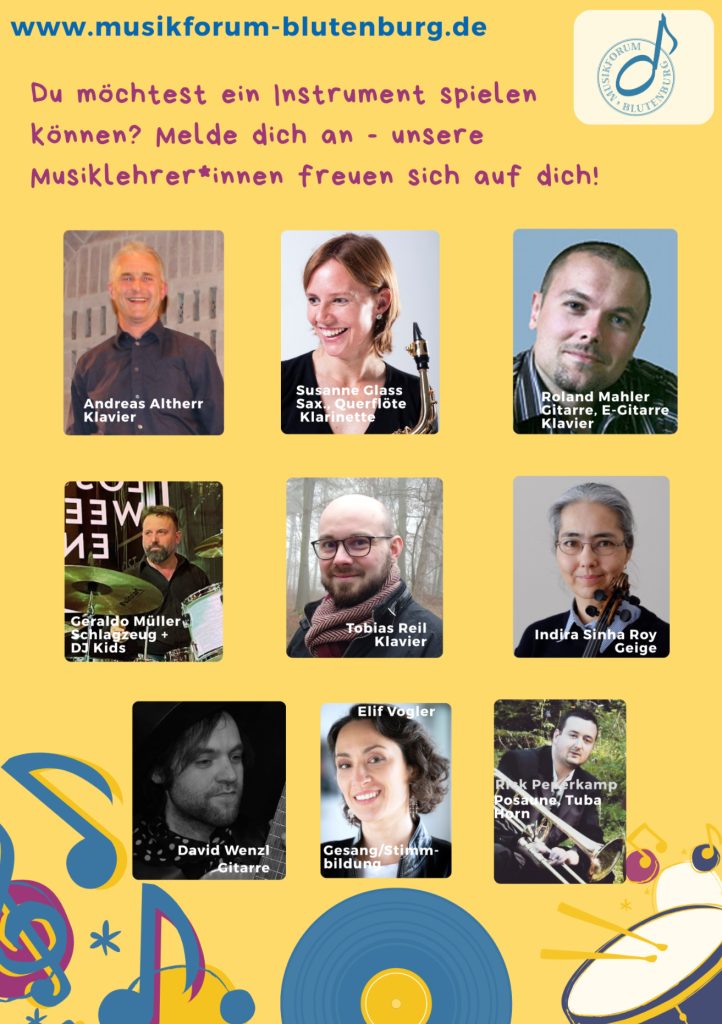 In Kooperation mit dem Musikforum Blutenburg e.V. bieten wir Instrumentalunterricht in folgenden Fächern an: Gitarre, Saxophon, Klavier, Querflöte, Geige, Klarinette, E-Gitarre, Posaune, Tuba, Horn und Schlagzeug. Seit diesem Schuljahr gibt es auch Gesangsunterricht und die DJ-Kids.